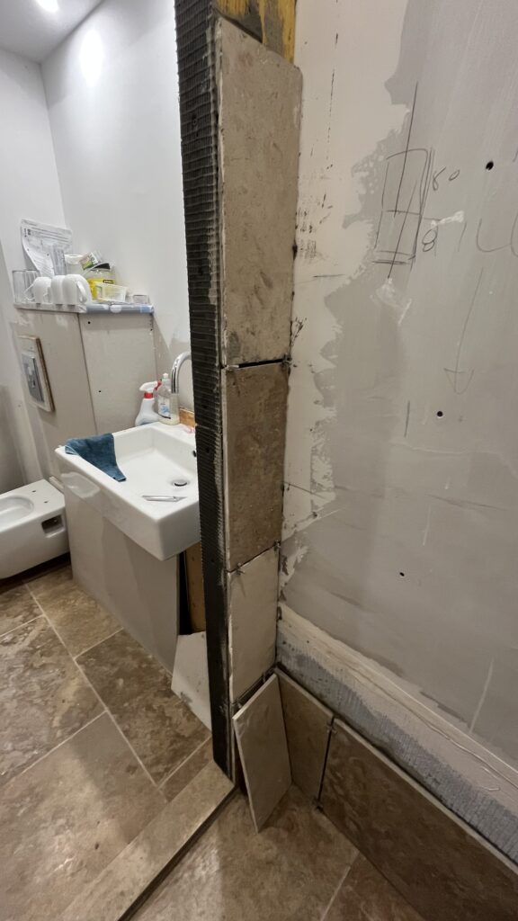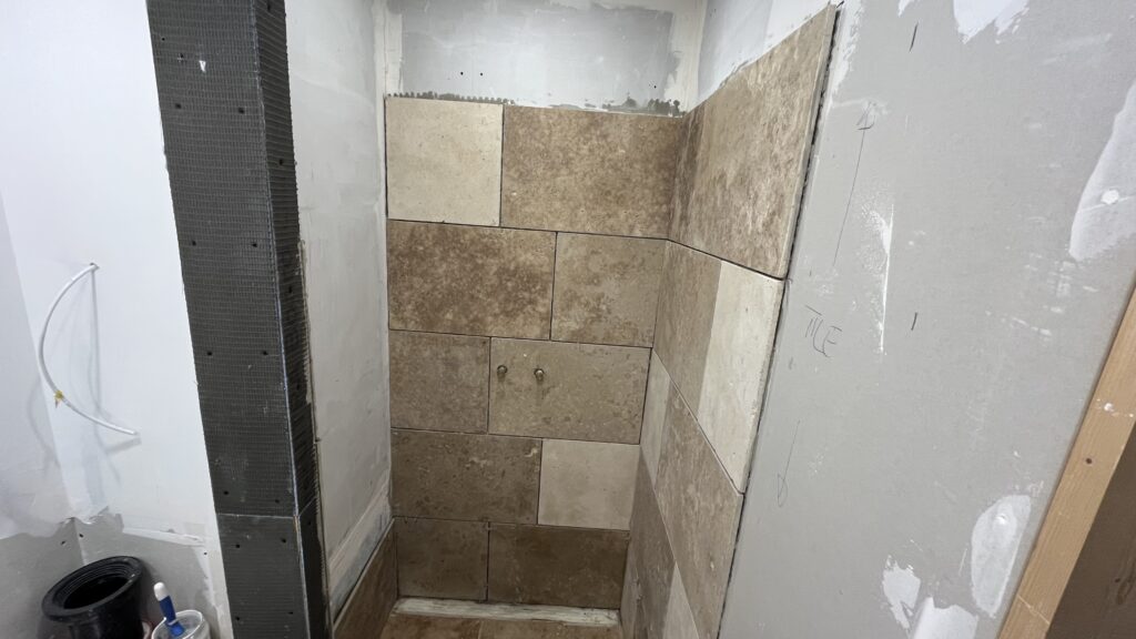 August 13 13 August 202527 April 2026 gjj More work on the shower. Note the quality of engineering drawings on the wall.